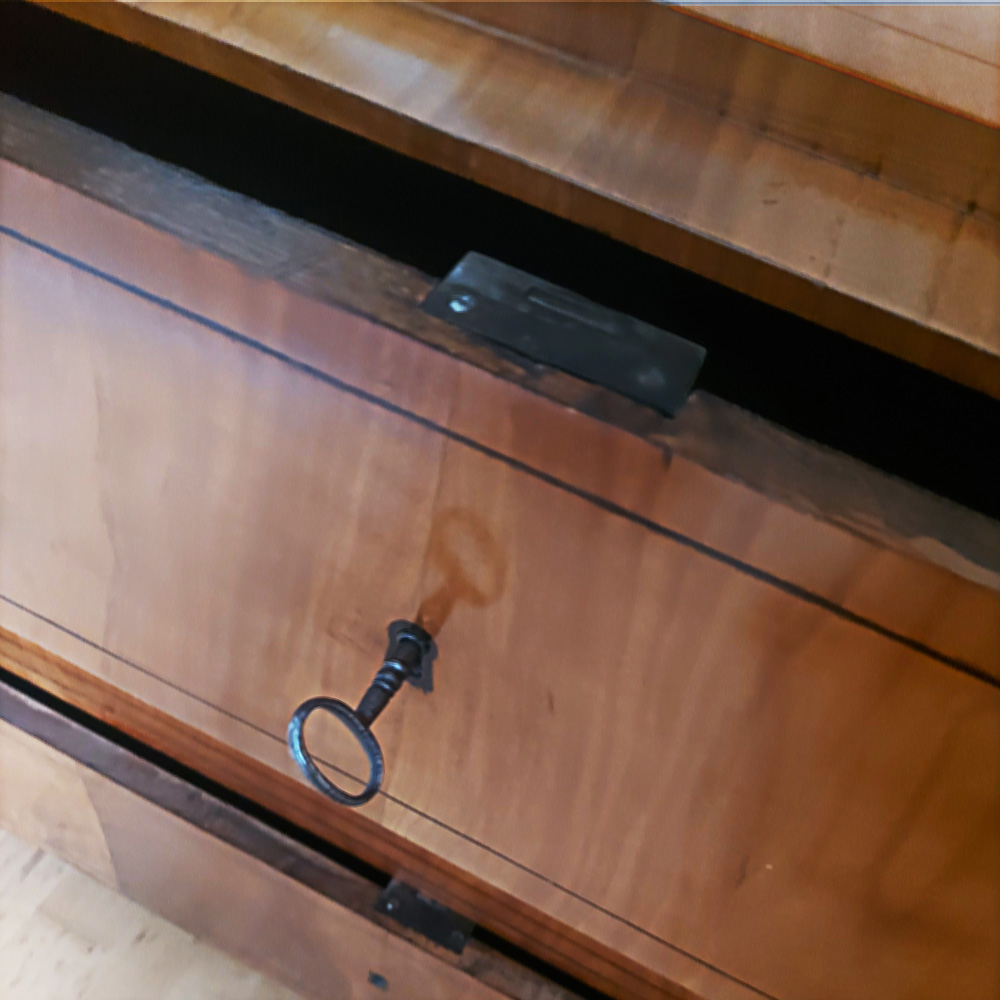 Schlösser und Schlüssel original, minimale Ergänzungen, fachgerecht restauriert, vorn abgerundete Seiten, die Schubkästen abgesetzt