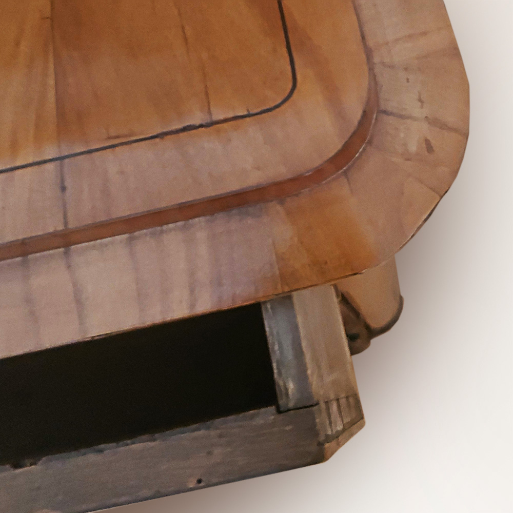 Kirschbaum auf Tanne und Linde furniert, mit feinen Fadeneinlagen in dunklem Holz, Schellackoberfläche