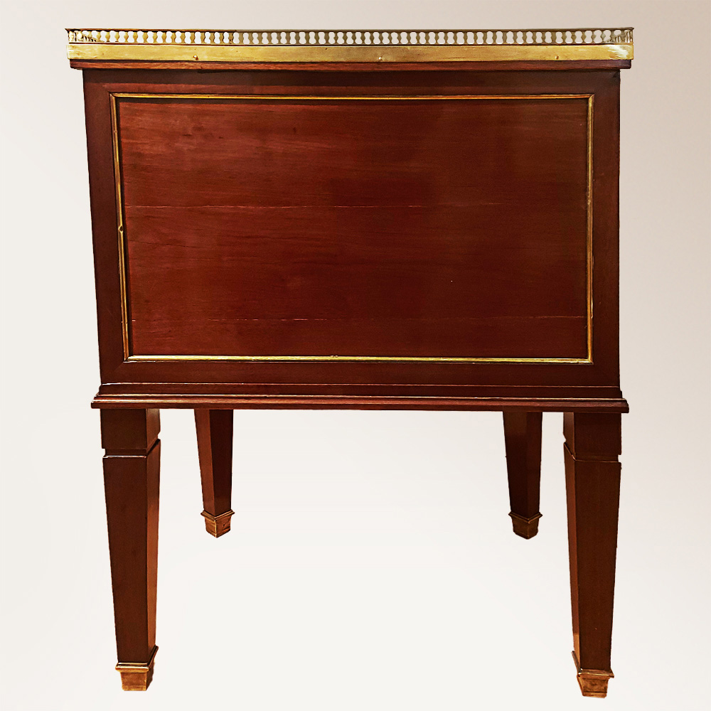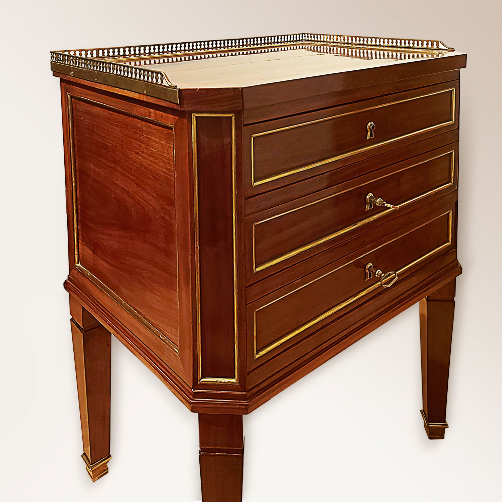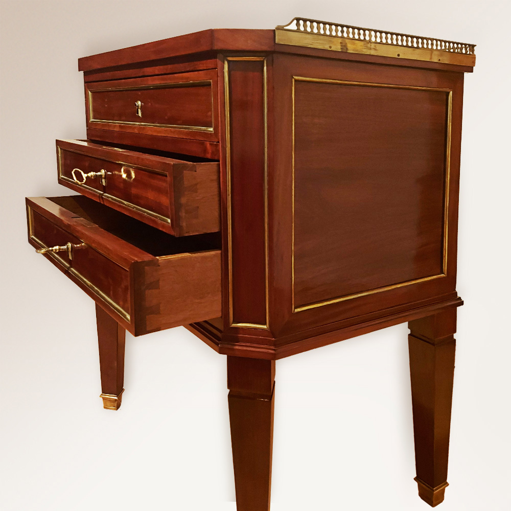 Die 3 Schubkästen in Eiche gearbeitet, frei stellbar, da allseitig furniert,Viertelrundstäbe in Messing, Messinggeländer an der Deckplatte. Feine, elegante Ausführung auf hohen konischen Beinen