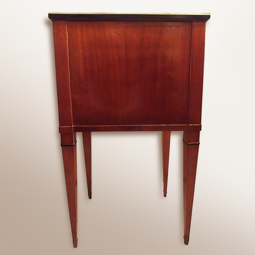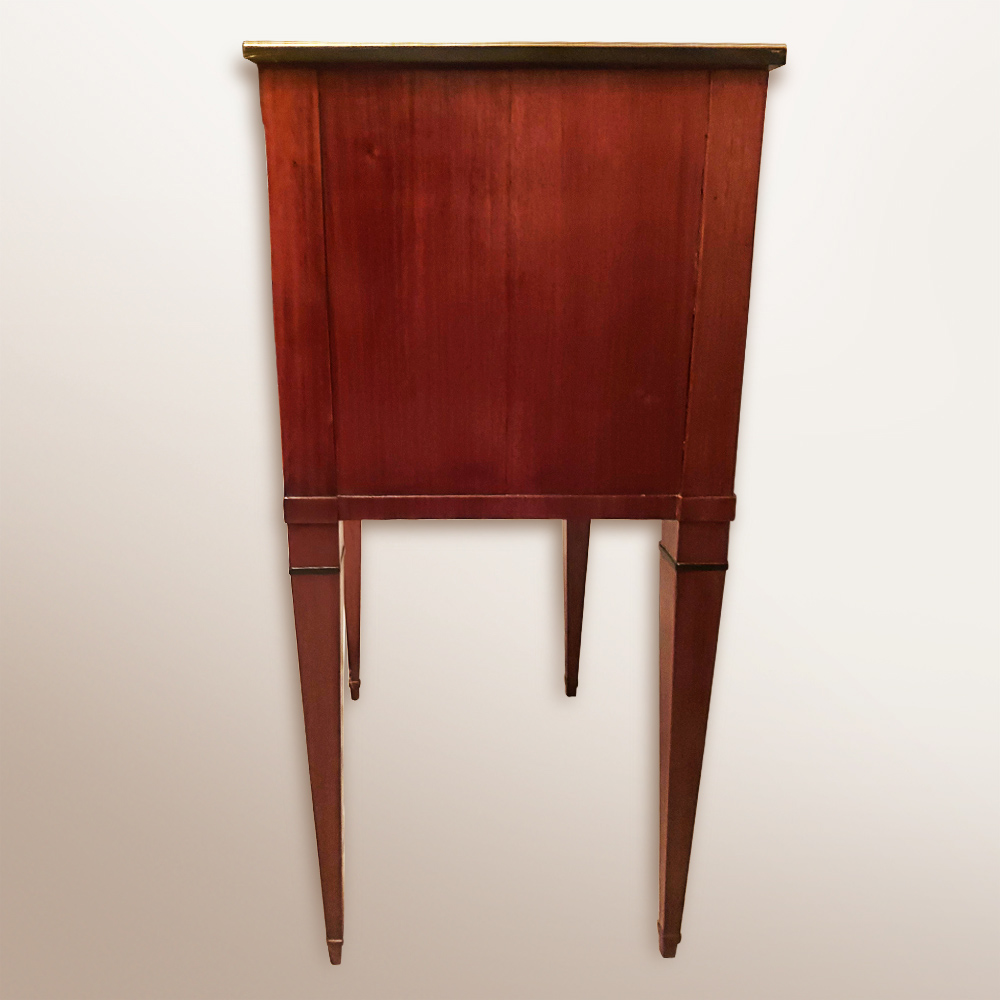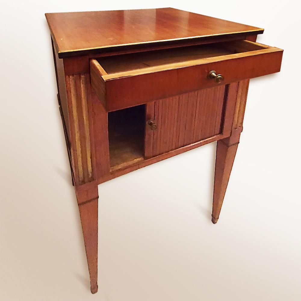 Die Schublade in Kirschbaum. Rolladenverschluß im unteren Bereich. Das Möbel ist frei stellbar, da rundum furniert. Die hohen konischen Beine geben ihm eine elegante Leichtigkeit.