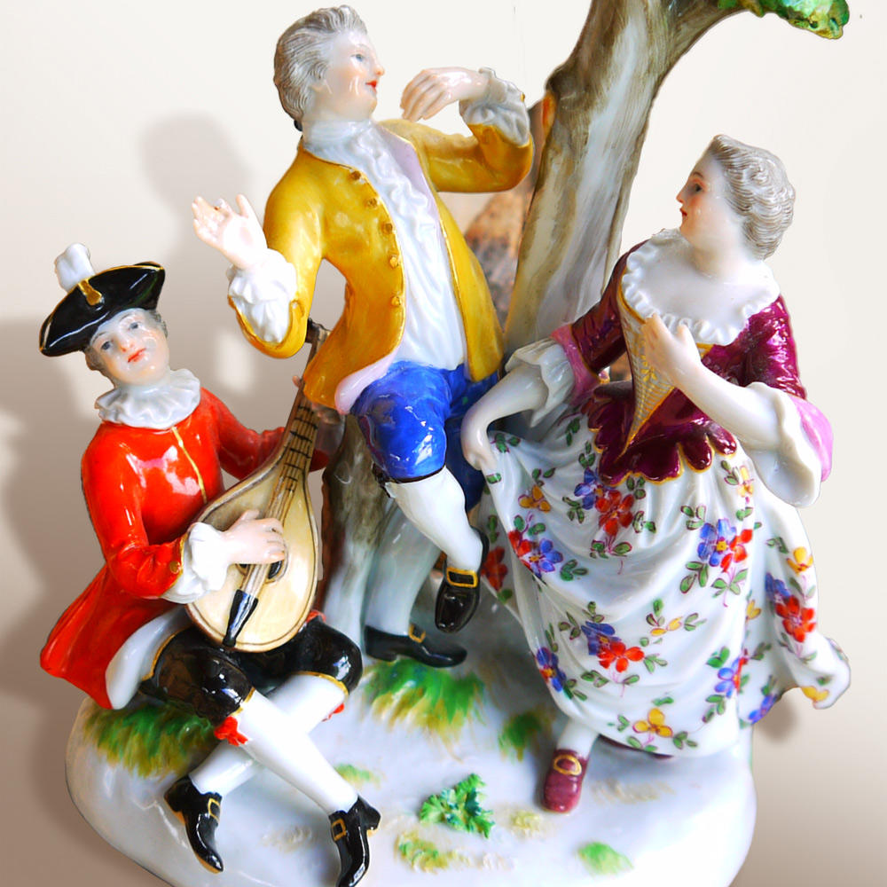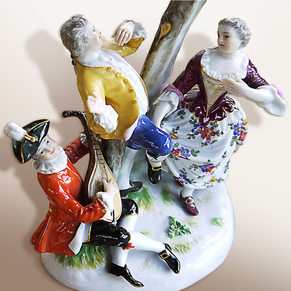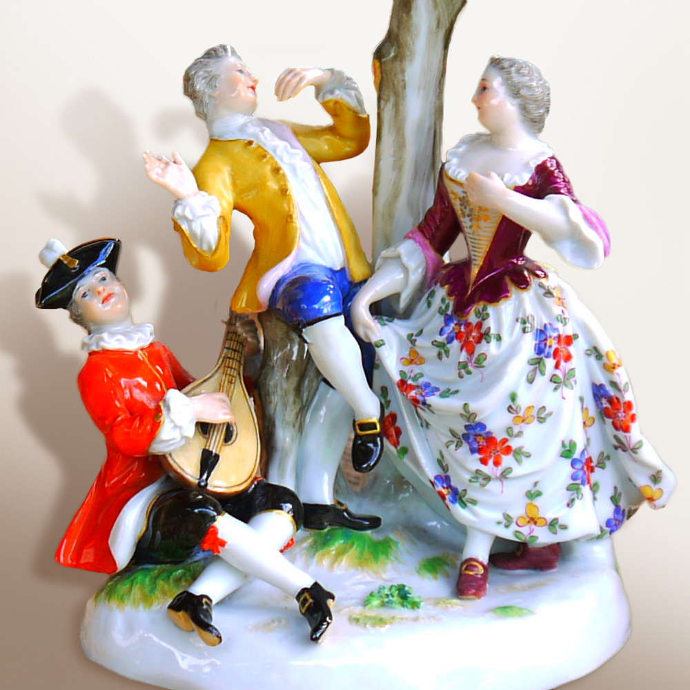 Tanzendes Paar mit Mandolinenspieler. Meissener Figurengruppe, um 1745 modelliert.