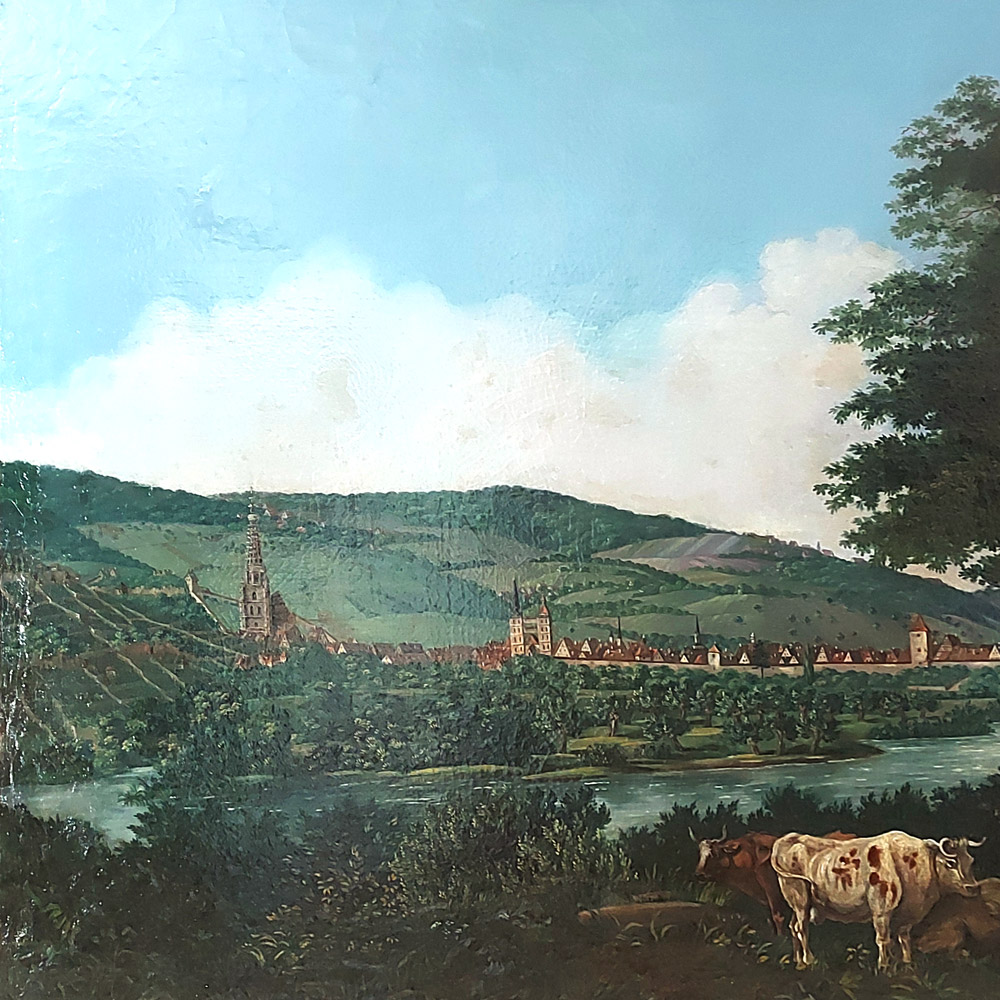 Das Bildnis zeigt den Neckar mit Baumwiesen, die alte Stadtmauer, die Pliensaubrücke und die Ausläufer des Schurwalds zum Neckartal hin. Im Vordergrund einen Bauern in Tracht mit weidenden Kühen, eine Bäuerin, auf dem Kopf einen Korb tragend.